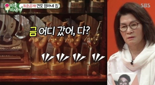지난해 8월 방송된 SBS '미운우리새끼'에서도 '금 기부' 사실이 언급된 바 있다. 당시 방송에 공개된 김건모 모친의 집에서 금이 전부 사라진 트로피들이 포착됐기 때문이다. 이에 대해 김건모는 "IMF 시절 금 모으기 때 다 냈다"고 언급했고, 김건모 모친 역시 "금을 다 떼어서 김대중 대통령 때 금을 다 냈다. 하나에 16돈씩이었다"고 밝혔다.