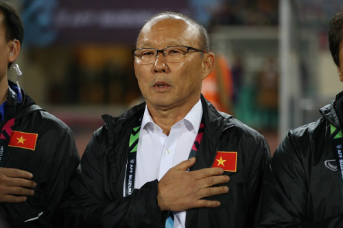 15일 오후 베트남 하노이의 미딘 국립경기장에서 열린 베트남과 말레이시아의 2018 아세안축구연맹(AFF) 스즈키컵 결승 2차전에서 박항서 감독이 국기에 대한 경례를 하고 있다. 하노이=연합뉴스