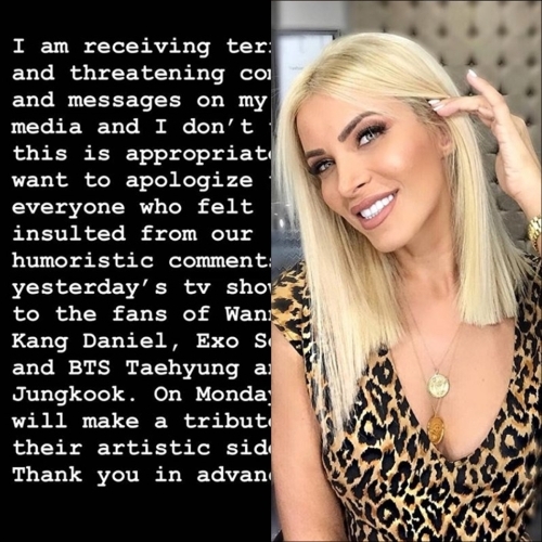 | 엑소와 방탄소년단을 향해 "여자 같다"며 외모를 비하한 방송인이 사과했지만, 논란이 계속되고 있다. 카테리나 카이노르기요 인스타그램 캡처 |