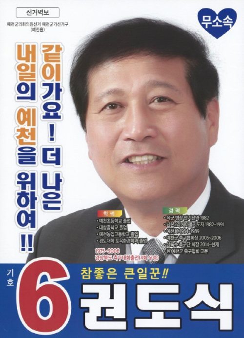 한편 권 의원은 경북도립대 토목환경학과를 졸업했다. 남본2리 새마을 지도자(1982~91)와 예산군 축구협회장(2005~06)을 거쳐 상록수 축구단 협회장(2014~현재) 맡고 있으며, 예천군 축구협회 고문을 역임했다.