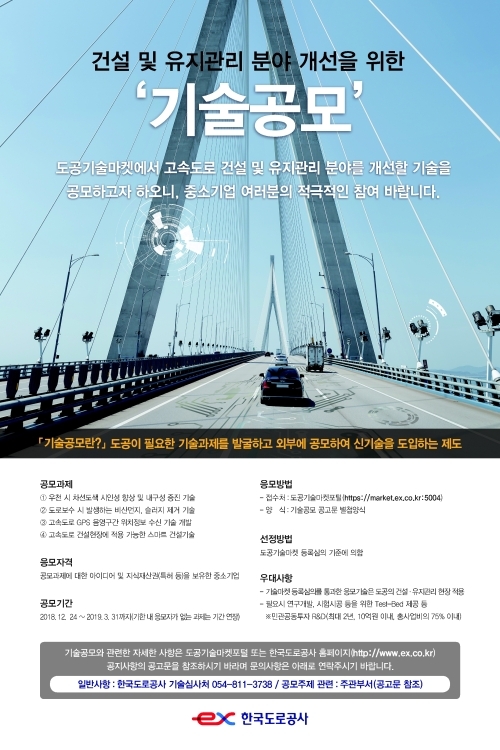 이강훈 한국도로공사 부사장은 “이번 기술공모를 통해 도로교통분야 혁신기술을 적극적으로 도입하고, 연구개발이 필요한 기술은 개발자금을 지원하여 중소기업의 기술혁신을 견인하겠다”며 “개발된 기술에 대하여는 유지관리 현장 등에 적극 도입하는 등 앞으로도 중소기업 지원을 위한 일원화된 창구로서 도공기술마켓의 역할을 강화해 나가겠다”고 말했다.