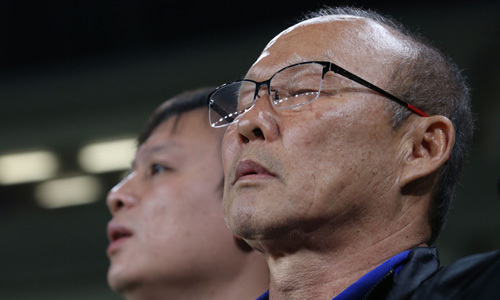 | 17일 아랍에미리트 알 아인 스타디움의 아시안컵 축구대회 조별리그 D조 최종전에 앞선 의식에서, 베트남의 박항서 감독이 가슴에 손을 얹고 국가 연주를 듣고 있다. AFP연합뉴스 |