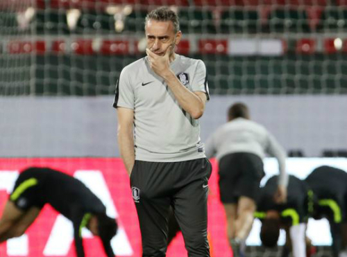 | 2019 AFC 아시안컵 16강 경기인 한국과 바레인전을 하루 앞둔 21일 오전(현지시간) 아랍에미리트 두바이 막툼 빈 라시드 경기장에서 한국 축구대표팀 파울루 벤투(사진) 감독이 훈련 중인 선수들을 지켜보며 고민에 빠진 모습. |