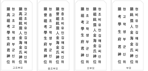 일반적으로 아버지의 경우 현고학생부군신위(顯考學生府君神位)로 적고 어머니의 경우 현비유인김해김씨신위(顯孺人金海金氏神位)로 적는다.