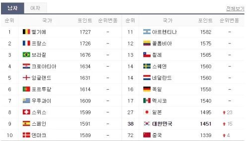 한편 FIFA 랭킹 1위는 벨기에가 차지했다. 2위는 2018 월드컵 우승팀 프랑스가 이름을 올렸다.