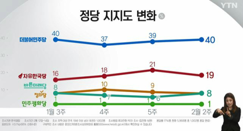 반면 더불어민주당은 오른 40%로 나타났다. 이는 직전 조사 대비 1%포인트 오른 수치다. 민주당은 1월 넷째 주 조사에서 37%로 떨어진 뒤 3주 만에 다시 40%대를 회복했다.바른미래당과 정의당은 직전 조사와 같은 지지율이 8%를 기록했다. 민주평화당 1%로 나타났다.무소속 층에 대한 지지율은 24%였다.