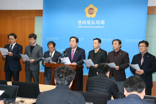 | 전북도의회 환경복지위원회 의원들이 지난 14일 기자회견을 갖고 군산·임실·익산 등지 불법 폐기물에 대한 대책 마련을 요구하고 있다. 전북도의회 제공 |