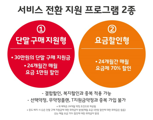 2G 가입자는 서비스 전환 시 ▲첫 번째, 30만원의 단말 구매 지원금과 24개월간 매월 요금 1만원 할인 ▲두 번째, 24개월간 매월 사용 요금제 70% 할인 중 한 가지 혜택을 선택할 수 있다. 결합할인이나 각종 복지할인도 중복 적용된다. 단, 3G 전환 시에는 현재 SK텔레콤이 판매 중인 3G 단말이 없는 관계로 두 번째 혜택만 선택 가능하다. 또한 단말 공시지원금이 30만원 이상일 경우 공시지원금 금액 전체를 지원하며, 단말 출고가가 30만원 미만일 경우에는 출고가 금액만큼 지원한다.