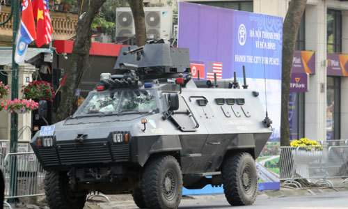 김정은 북한 국무위원장의 2차 북·미 정상회담 숙소인 베트남 하노이 멜리아 호텔 주변에 장갑차를 동원한 병력이 27일 배치돼 있다. 이 장갑차는 국내업체인 신정개발특장차가 생산해 베트남에 수출한 제품이다. 하노이=연합뉴스 |