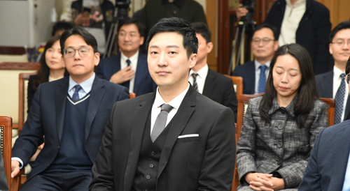 | 지난 4일 사법연수원 50기 연수생 임명식에서 ‘나홀로 연수생’ 조우상씨가 그보다 훨씬 더 많은 교수진 앞에 앉아 있다. 연합뉴스 |