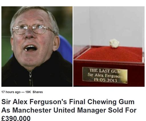 보도에 따르면 이번 경매에 팔린 껌은 2013년 5월19일 퍼거슨의 감독 은퇴 경기였던 맨유와 웨스트 브로미치 앨비언 FC전에서 그가 씹었던 것으로 알려졌다 .