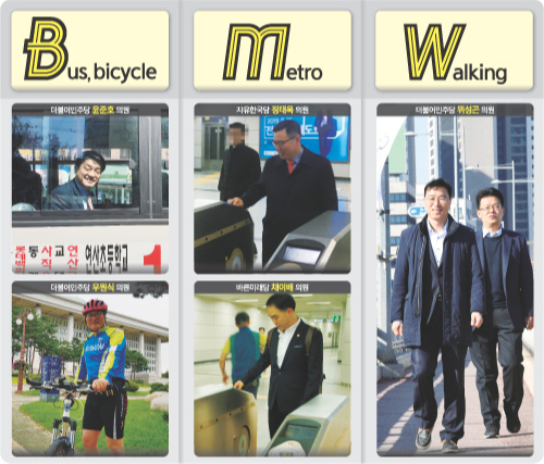 물론, 각 지역구와 국회를 오가려면 차량은 필수다. 하지만 “미세먼지 감축을 위해 노력하자”고 목소리를 내면서 정작 상당수 의원은 심지어 경유차를 타고 다닌다. 지난해 7월 환경재단이 정보공개를 청구한 결과 20대 국회의원별 국회 등록 출입차량 300대 중 114대(38%)가 경유차인 것으로 드러났다. 일부 환경단체를 중심으로 국회의원부터 대중교통 이용을 활성화해야 한다는 지적이 나온다. 이런 가운데 정 의원처럼 국회에는 일명 ‘BMW(버스·바이크, 메트로, 워킹)족’이 있다. 버스나 지하철 등 대중교통을 애용하기도 하고 근거리는 가급적 걸어다니거나 자전거를 타고 다니는 의원도 적지 않다.