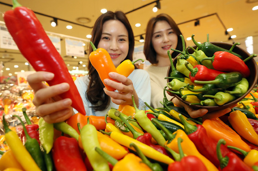 26일 오전 서울 중구 롯데마트 서울역점에서 모델들이 고당도 파프리카와 이색 고추를 선보이고 있다. 롯데마트는 3일까지 전 점에서 트리벨리 파프리카(400g)를 4980원, 과일 파프리카(200g)를 3280원, 노란고추와 청양고추를 함께 묶은 ‘더 매운 고추’(150g)를 2180원, 당조고추(150g)를 2980원에 판매한다.