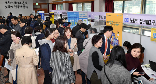 28일 서울 동작구청 대강당에서 열린 ‘2019 취업 박람회’가 구직희망자들로 붐비고 있다. 26개 업체가 현장 면접을 통해 필요 인력을 뽑았다.