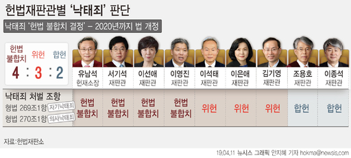 구체적으로 유남석 헌재소장을 포함한 6기 헌법재판관 9명 중 7명이 낙태죄는 헌법에 위반된다고 봤다. 위헌 결정은 재판관 6인 이상의 찬성이 있어야 한다.
