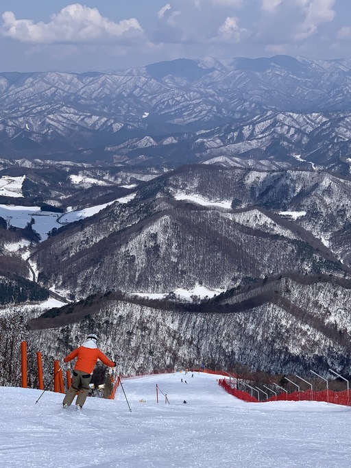 “벚꽃 핀 4월의 봄날에 스키를 즐기세요.”