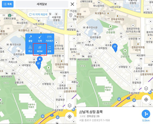 ◆카카오맵 통해 w3w 주소 확인하고 공유 가능