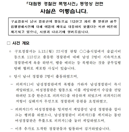 앞서 지난 15일 각종 온라인 커뮤니티에 ‘대림동 경찰 폭행’이라는 제목의 영상이 게재되면서 누리꾼들의 주목을 받았다.