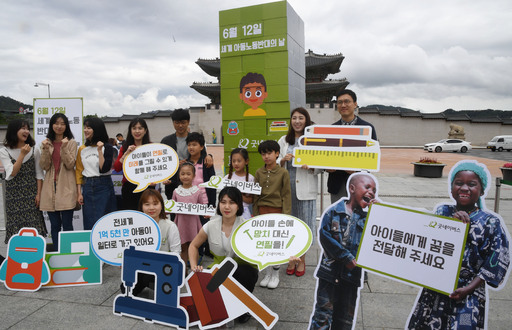 '세계 아동노동반대의 날'을 이틀 앞둔 10일 오전 서울 종로구 광화문광장에서 굿네이버스 관계자들이 시민들과 아동노동 근절 캠페인을 하고 있다.