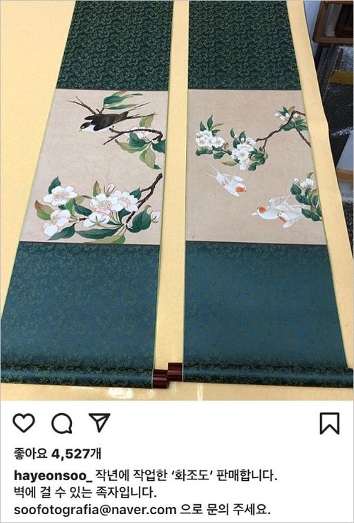 지난 18일 하연수는 SNS에 “작년에 작업한 ‘화조도’ 판매한다”며 “벽에 걸 수 있는 족자”라는 글과 함께 사진을 게재했다.