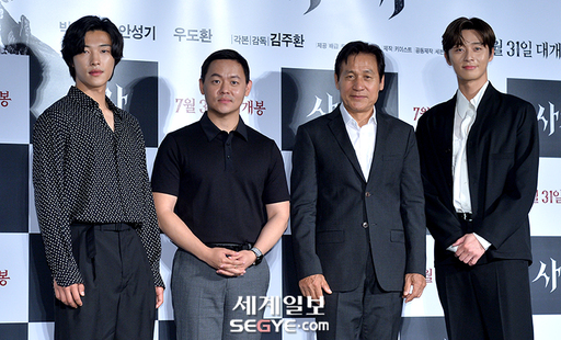 배우 우도환, 김주환 감독, 배우 안성기, 박서준(사진 왼쪽부터)이 26일 오전 서울 광진구 자양동 롯데시네마 건대입구점에서 진행된 영화 '사자'의 제작보고회에 참석해 포즈를 취하고 있다.