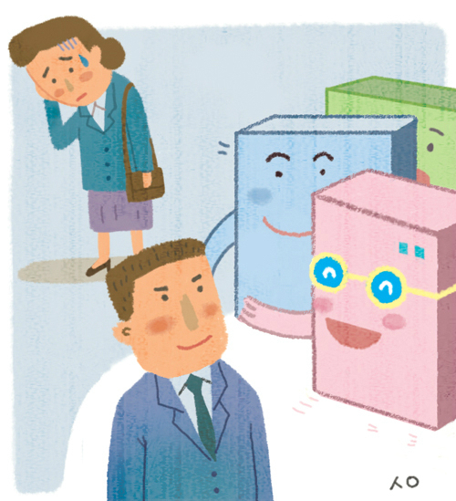 비정규직 비율을 보더라도 ‘질 좋은 일자리’에 가기 더 힘든 여성의 입지가 드러난다. 전체 임금근로자에서 비정규직 비율이 남성의 경우 2008년 28.8%에서 2018년 26.3%로 줄어든 데 반해 여성의 비정규직 비율은 40.7%에서 41.5%로 늘었다. 통계청 관계자는 “여성 비정규직이 남성보다 더 많이 늘어난 경향이 있다”고 했다. 여성 상용근로자(계약 기간 1년 이상 안정적으로 고용된 경우) 비중은 47.4%로 남성(54.3%)보다 낮았고 임시근로자 비중은 여성이 25.5%로 남성(12.6%)의 2배 이상이다.