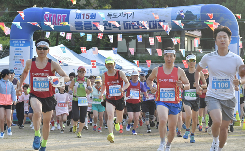 아직 동해바다에서 동이 트기도 전인 14일 오전 6시. 대한민국에서 가장 일출이 빠르다는 경북 울릉군 울릉읍 사동리에 있는 울릉문화예술 체험관은 마라톤 대회에 참석한 건각들의 독도 수호 의지를 다짐하는 고함 소리로 가득찼다.