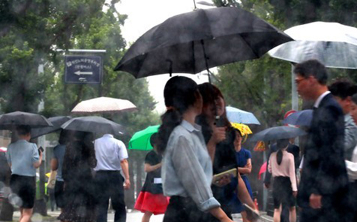 장맛비가 내린 지난 25일 오후 서울 종로구 도렴동에서 시민들이 우산을 쓴 채 횡단보도를 건너고 있다. 연합뉴스