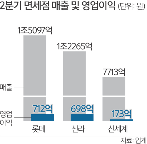 롯데면세점은 2분기에 매출 1조5097억원, 영업이익 712억원의 실적을 올렸다. 매출은 지난해 같은 기간보다 5.5% 늘었지만 영업이익은 45.3나 급감했다.