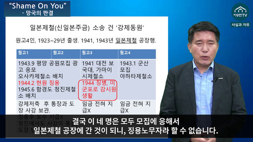 ‘주익종의 현대사 돋보기’의 ‘"Shame On You" - 망국의 판결’ 편에서 주 전 학예실장은 “일본제철(신일본주금) 소송 원고 4명은 모두 모집에 의해 자발적으로 일본에 갔다”며 “징용, 강제로 일본에 간 게 아니다”라고 주장했다. 그는 원고 4명 모두 1923년부터 1929년 사이 출생자라며, 1941년과 1943년에 일본제철 공장에 갔으니, 모두 미성년자 때라고 설명했다. 특히 이중 1929년에 태어난 원고에 대해서는 14살 때 일본에 간 것이 되기 때문에 “(일본 강제 징용 주장이) 믿기 어렵다”라고 했다.