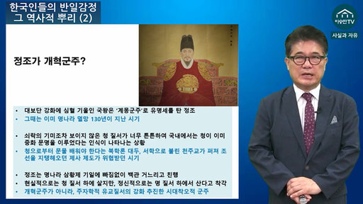 김 대기자는 ‘김용삼의 현대사 시시비시’의 ‘한국인들의 반일감정, 그 역사적 뿌리(2) 1637년에 멈춰버린 조선의 시간’ 편에서 조선 제22대 왕인 ‘정조’에 대해 “개혁군주가 아니라 주자학적 유교질서의 강화를 추진한 ‘시대착오적 군주’”라고 평가 절하했다.
