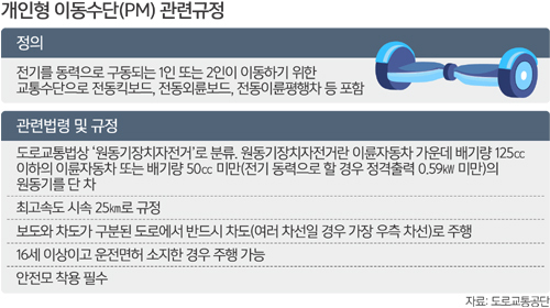 통상 개인형 이동수단은 도로교통법상 원동기장치자전거로 분류되기 때문에 보도와 차도가 구분된 도로에서는 차도를 이용해야 한다. 또 안전모를 반드시 착용해야 하며, 16세 이상, 운전면허 소지자만 사용이 가능하다.