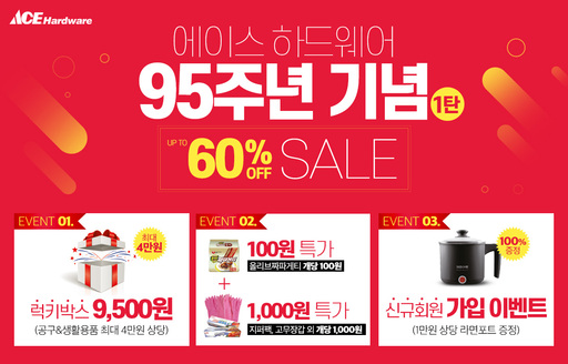 에이스 하드웨어는 올해로 창립 95주년을 맞아 전 세계 주요 매장에서 대규모 프로모션을 동시 진행한다. 이달 16일까지 진행되는 국내 첫 기획전에서는 가을 집 단장과 겨울 단열에 필요한 다양한 상품을 최대 60% 할인된 가격에 판매한다. 가성비가 높은 에이스 하드웨어 PB 상품 및 직수입 상품을 특가로 만나볼 수 있으며, 파격적인 사은행사와 특가혜택을 제공한다.