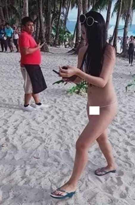 SNS에 전해진 사진에는 한 여성 관광객이 끈 형태로 된 비키니를 입고 해변을 걷는 모습이 담겼다.