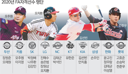 올 시즌은 어떤 선수가 프로야구 스토브리그를 뜨겁게 달굴까. KBO가 2020년 FA 자격선수 명단을 31일 공시했다. 올해 FA 자격선수는 모두 24명으로 이 중 11명이 새로 FA 자격을 얻은 선수들이다. LG와 한화가 각각 4명으로 가장 많고, 나머지 6개 구단도 적어도 한 명 이상의 선수가 FA 자격을 얻었다.
