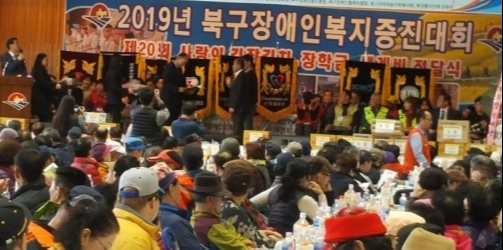 지난 23일 오전 11시 30분쯤 부산시 북구 덕천동 덕천초등학교 체육관. 체육관 안팎에는 북구 지역 곳곳에서 모여든 각종 장애인 1500여명이 자리한 가운데 ‘2019 부산 북구 장애인복지증진대회’가 진행 중이었다.