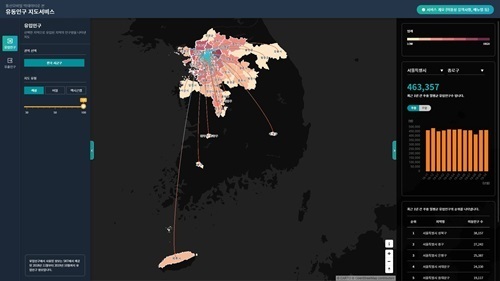 SK텔레콤과 통계청은 모바일 빅데이터를 기반으로 전국 시·군·구별 인구 유출·유입을 한눈에 볼 수 있는 ‘유동인구 지도 서비스’를 시작했다고 9일 밝혔다. 이 서비스는 시·군·구별 인구 이동 정보를 주말과 주중, 월별로 지도상에서 3차원 시각화해 보여주는 것으로, SK텔레콤과 통계청이 지난 5월 업무협약(MOU)을 체결한 이후 처음 내놓은 성과물이다.