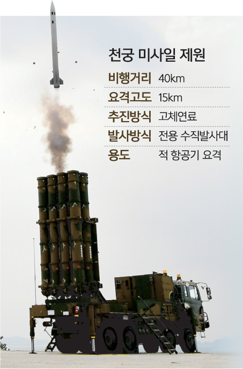 공군은 1960년대 개발된 미국제 호크(HAWK) 미사일을 수십년째 운용해왔다. 호크는 중동전쟁과 1차 걸프전 등에서 여러 대의 적기를 격추해 성능을 입증한 무기다. 하지만 노후화가 심해지면서 국내에서는 새로운 무기로 대체해야 한다는 지적이 끊이지 않았다. 이에 따라 등장한 것이 천궁(天弓) 미사일이다.