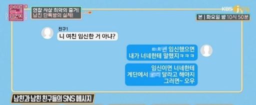한 친구가 사연자를 언급하며 "임신한 것 아니냐"고 하자 남자친구는 "임신했으면 내가 너희한테 말했지. 임신이면 너네한테 계단에서 굴려달라고 해야지"라고 충격적인 폭언을 내뱉었다.