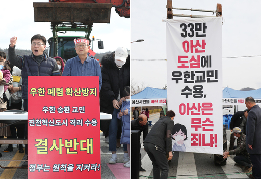 아산에서도 반발이 거세다. 아산 주민들도 트랙터와 지게차 등을 동원해 경찰인재개발원 진입로를 봉쇄했다. 이들은 트랙터 등을 치워달라는 경찰 요구에도 시위를 강행했다. 오세현 아산시장은 이날 사회관계망서비스(SNS)에 글을 올려 “국가적인 위기인 신종 코로나바이러스 감염증을 극복하기 위해 힘을 합치는 것은 당연한 일이지만, 아산시민의 안전대책이 먼저 해결돼야 하며 합리적인 이유도 있어야 한다”고 강조했다.