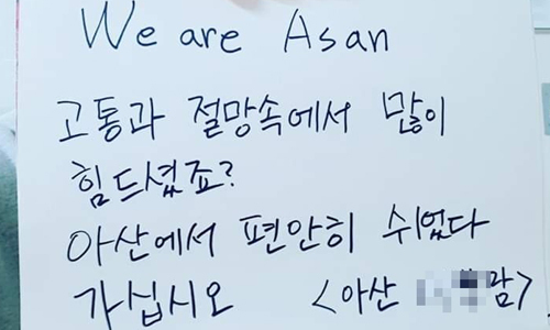 이어 권씨 역시 “We are Asan! 아산에 잘 오셨습니다. 잘 계시다 아무 탈 없이 가족의 품으로 돌아가시길 바람니다. 아산시민 권○○”이라고 적힌 손피켓 이미지를 공유했다.