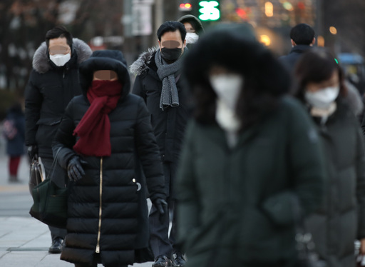 절기상 입춘이자 꽃샘추위가 찾아온 4일 오전 서울 광화문 사거리에서 두꺼운 복장을 한 시민들이 신종 코로나바이러스 감염증 예방 등을 위해 마스크를 쓴 채 걸어가고 있다. 연합뉴스