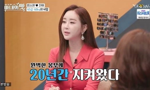 함소원은 “20년 전과 똑 같은 몸무게”라며 “매일 달리기 머신으로 땀을 빼고, 20㎏ 아령으로 근력운동을 해 취약한 허리를 보강한다”고 말했다.