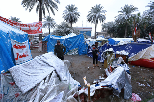 11일(현지시간) 이라크 바그다드에 12년 만에 눈이 내린 가운데 타흐리르 광장에서 반정부 시위대가 텐트에 쌓인 눈을 치우고 있다. 바그다드에 눈이 내린 것은 2008년 이후 12년 만이며, 2008년을 포함해 100년 만에 두 번째인 것으로 알려졌다. 중동 전문 매체 알아라비는 2008년엔 눈이 내린 시간도 짧았고 진눈깨비였지만 이번에는 함박눈이 내려 바그다드 시민들이 제대로 눈을 즐길 수 있었다고 전했다. 남부 카르발라에도 이날 약 40년 만에 눈이 내렸다. 이라크 바그다드와 남부지역은 여름 최고 기온이 섭씨 50도를 넘나들 정도로 중동에서도 가장 더운 곳으로 꼽힌다.
