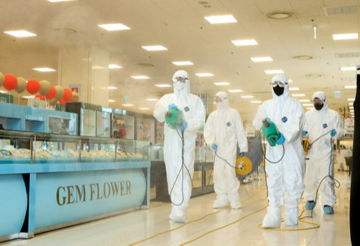 신종 코로나바이러스 감염증(코로나19) 확진자 부부가 다녀간 것으로 파악된 대전 유성구 롯데마트 노은점 내부를 23일 대전시가 방역하고 있다. 연합뉴스