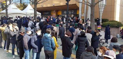 신종 코로나 바이러스(코로나19)의 지역사회 감염 우려가 더해지고 있는 대구·경북의 보건당국과 이마트가 공동 확보한 마스크 판매가 시작되자 이를 구매하려는 시민들이 인산인해를 이루었단 소식이 24일 전해졌다.