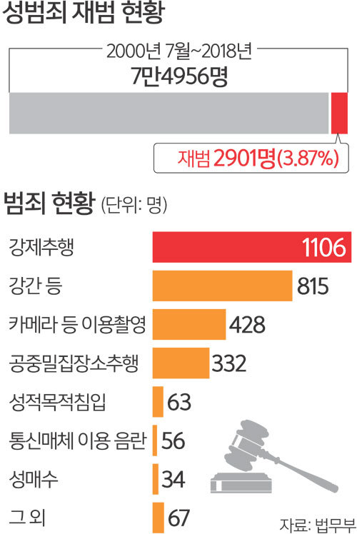 성범죄의 재범 비율은 높지 않지만, 성범죄 자체는 빠르게 늘고 있다. 법무부 관계자는 “최근 5년간 신규 등록된 성범죄 대상자는 연평균 1만2755명”이라며 “누적 대상자는 지난해 말 기준 8만2647명으로 올해 중 10만명을 넘어설 것으로 예상된다”고 말했다.