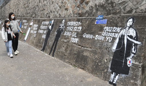 대한민국임시정부 수립 101주년을 맞아 12일 오후 서울 종로구 정독도서관 독립운동가의 길 담벼락에서 시민들이 그래피티 작품을 감상하고 있다. 최성욱 작가는 자신이 7년 전에 그린 독립운동가들의 초상 그림을 보완 작업했다.
