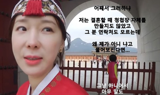 “제가 아니옵니다”로 시작된 물음에 “어째서 그러하냐”고 묻자 “저는 결혼할 때 청첩장 자체를 만들지도 않았고 그분 연락처도 모르는데 왜 제가 아니냐고 물어보신다면…그냥 아니어서 아무 말도 아니 한 건데”라고 썼다. 출처는 ‘밉지 않은 장금 중에서’라며 자신의 유튜브 채널 ‘밉지않은 관종언니’와 ‘대장금’을 합치는 유머도 보여줬다.