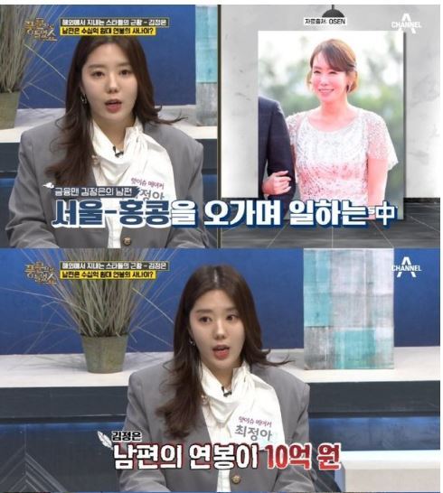이날 방송에 출연한 최정아 스포츠월드 기자는 김정은 남편에 대해 “서울 여의도에 있는 외국계 금융 투자사의 펀드 매니저로 서울과 홍콩을 오가며 일하고 있다”라며 “연봉이 10억원이라는 사실이 알려져 화제가 되기도 했다”고 전했다.